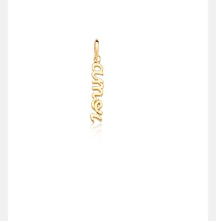 Este pingente apresenta um acabamento dourado, conferindo um aspecto refinado e moderno. A peça é leve e possui formato vertical com o nome "amor" de maneira legível e harmônica. Compatível para uso com diversas correntes finas, sendo um acessório versátil para complementar qualquer look.